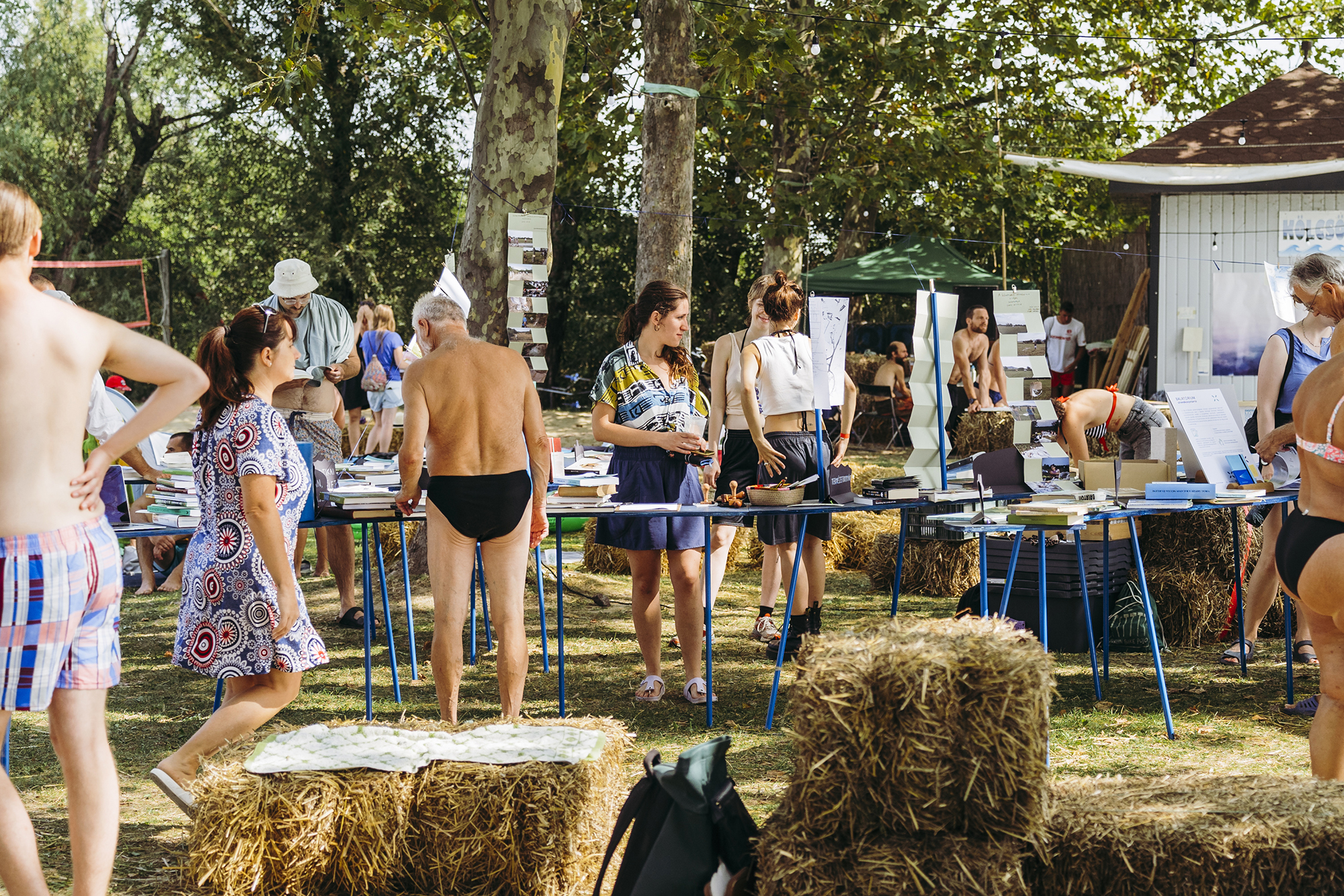 A strandkönyvtár 2023 augusztusában a BALATORIUM kulturális és ökológiai hétvégén debütált. A kötetek mint például a Balatoni természetkalauz (szerk. Vörös Lajos), A gézengúzok a Balatonnál (Rónaszegi Miklós) vagy az extrodæsia Enciklopédia egy emberközpontúságot meghaladó világhoz (szerk. xtro realm) az Örvényesi strandon, a Balaton közvetlen közelében voltak olvashatóak. A válogatás alapját a program szervezőitől, a helyi és nemzetközi résztvevőktől származó ajánlások adták.